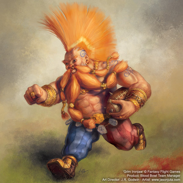 Le Culte des Tueurs de Trolls est un aspect étrange mais bien documenté de la vie des nains, perçu comme la seule option qui reste à ceux qui ont commis un acte honteux. Abandonnant tous leurs biens matériels et enduisant symboliquement leurs cheveux de graisse de porc, ces nains contrits cherchent une mort honorable au combat face aux ennemis les plus terrifiants qu’on puisse imaginer, traditionnellement sur le champ de bataille, mais tout cela changea lorsque Grim Ironjaw rejoignit les Black Moutain Blades. Rétrospectivement, il est difficile à croire qu’il fallut attendre si longtemps pour qu’un Tueur de Troll entre sur un terrain de Blood Bowl. Où peut-on mieux trouver une mort glorieuse que dans une arène entourée de supporters beuglants, et dans laquelle une équipe de grosses brutes fait tout son possible pour vous briser les os ? L’équipe des Blades s’y prêtait particulièrement bien, étant l’une des rares équipes non orques de la ligue de la Vallée du Tonnerre, et Ironjaw put y affronter régulièrement des trolls et des orques noirs. La nouvelle de ses prouesses se répandant, les Tueurs de Trolls s’intéressèrent de plus en plus au jeu, pour en arriver à l’état actuel des équipes de Nains, qui incluent pour la plupart un ou deux de ces fous à crête. Suite à une première saison réussie, Ironjaw passa plusieurs années à se déplacer d’équipe en équipe afin de monter au classement des ligues. De son point de vue, la mort la plus glorieuse devait l’attendre au Blood Bowl lui-même, face à l’une des équipes les plus accomplies de la NAF. Il n’a pas encore pu participer au célèbre tournoi, mais à chaque saison qui passe, ses chances s’améliorent et sa légende grandit. Qui sait ? Ce sera peut-être pour cette année !